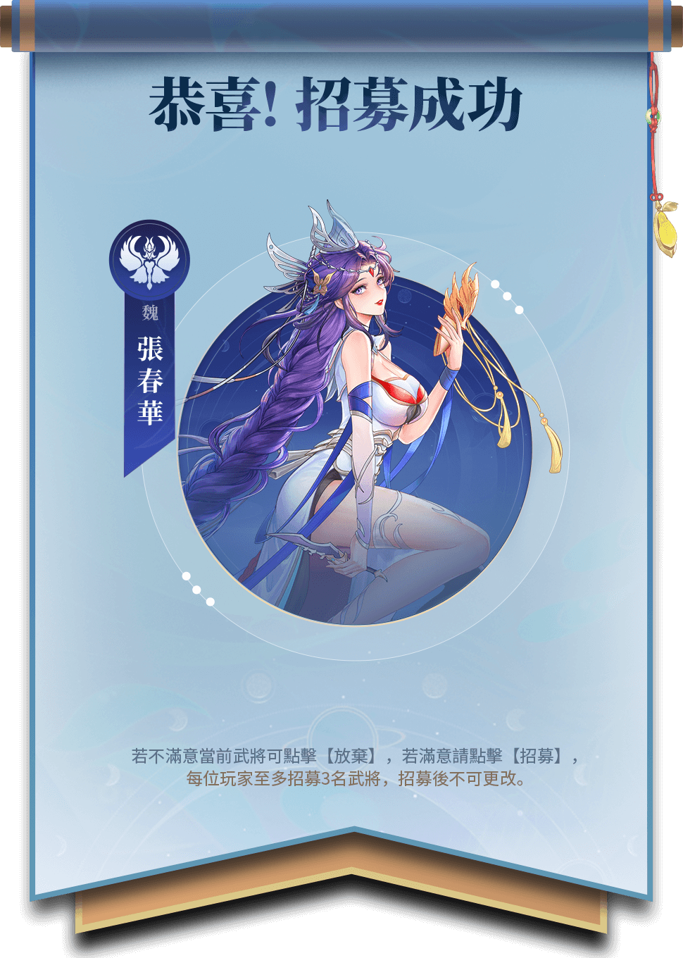 2玩家招募1次後,都需要在出卡結果彈窗進行選擇,點擊 【放棄】卡片將默認放棄此張卡片獎勵,點擊【招募】該名武將會出現在已招募武將中並領取到對應獎勵序號,選擇不可逆。